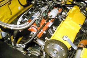 Моторный отсек. Двигатель наклонен по компоновочным соображениям, чтобы поместилась система впрыска. Сдвижной шкив ГРМ позволяет легко менять фазы газораспределенияСистема впрыска Knobloch делается специально для спорта небольшой немецкой мастерской и стоит около $3000. Она не лишена недостатков, но обладает одним главным достоинством: пилот может прямо на ходу производить все регулировки с пульта, вынесенного на переднюю панель. В большинстве других систем для этого нужно перепрограммировать управляющую микросхему, что требует немалого времени и специального оборудования.